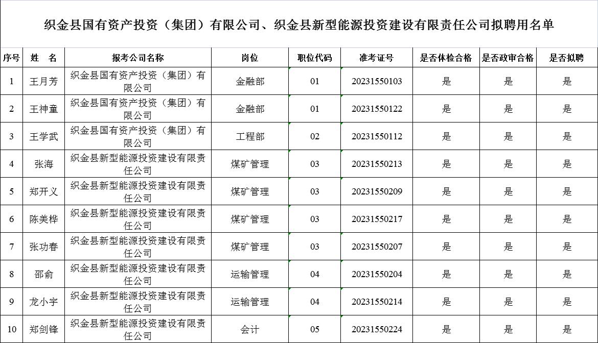 根據(jù)《織金縣國有資產(chǎn)投資(集團(tuán))有限公司、織金縣新型能源投資建設(shè)有限責(zé)任公司2023年面向社會公開招聘工作人員公告》,經(jīng)過報(bào)名、筆試、面試、資格審查、體檢、政審等程序,現(xiàn)對擬聘用人(名單見附件1)予以公示。kwR貴州163_163貴州事業(yè)單位考試信息網(wǎng)_163貴州人事考試信息網(wǎng)_貴州163網(wǎng)