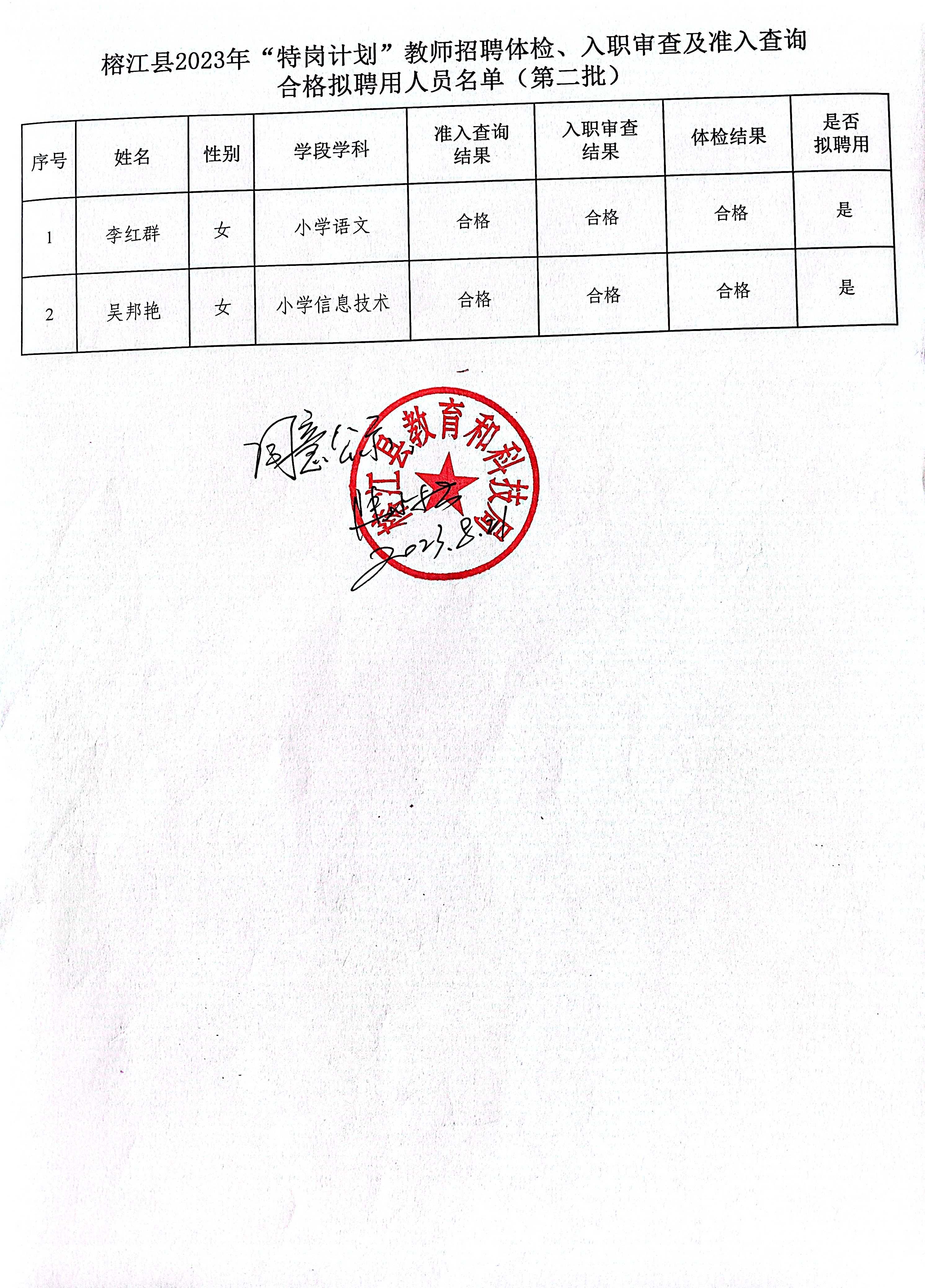 2023黔東南榕江縣“特崗計劃“教師招聘體檢、入職審查及準(zhǔn)入查詢合格擬聘用人員名單公示(第二批2人)